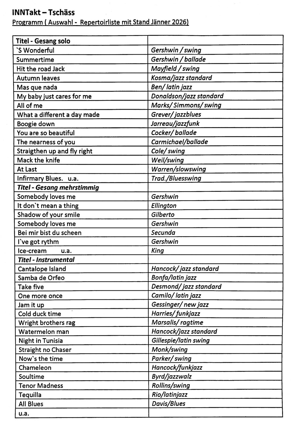 Hier ist der Soundtrack für euer nächstes Event! Wir haben unsere Repertoireliste frisch aktualisiert. Schaut rein und findet eure Lieblings-Classics von INNtakt Tschäss..